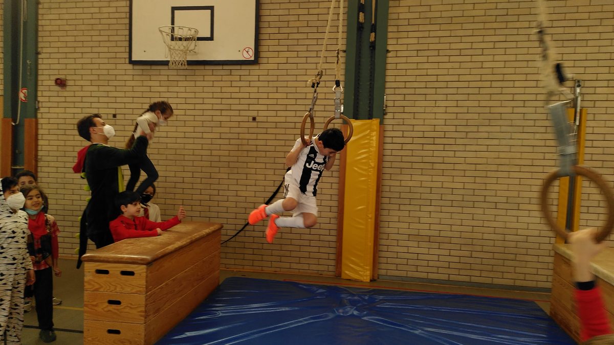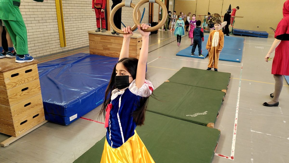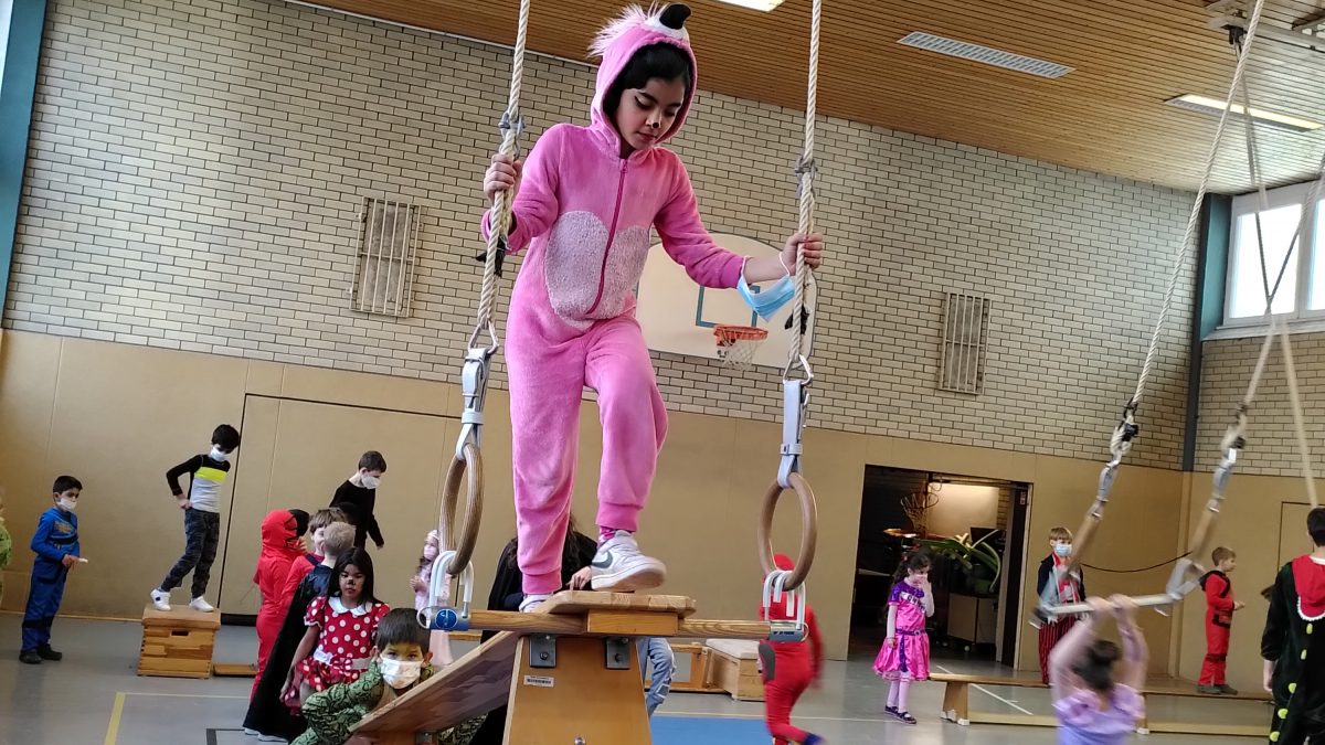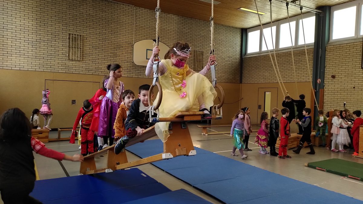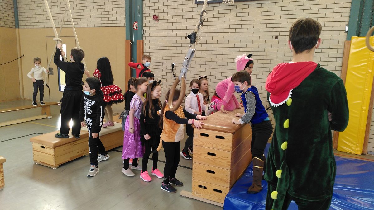 Ein besonderes Highlight für alle Klassen war sicherlich die Bewegungslandschaft in der Turnhalle, die von den Sportlehrkräften vorbereitet worden war und viele Anreize zum Klettern, Hangeln, Schwingen und Springen bot, damit sich alle kleinen Jecken austoben konnten.