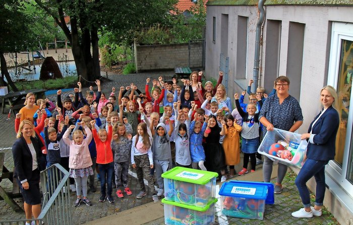 Die Drittklässler freuen sich über die Spielsachen, die Juliane Majorczyk (Zweite von rechts) und Maike Kulins (rechts) mitgebracht haben. Die Geräte sind mehrheitlich beim Spielen auf dem Schulhof einsetzbar. Auch aus Hygienegründen erhält jede Klasse ihre eigene Box. foto: Stephan Hartung